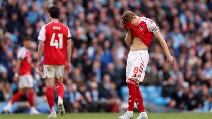 The 2-1 defeat to City on Sunday at the Etihad was the Gunners’ fourth in a row on the domestic stage after their loss in the Carabao Cup final, also to Pep Guardiola’s side, was followed by a shock FA Cup exit against Southampton. The Gunners are on the brink of being displaced at the top of the table, as victory for City against Burnley at Turf Moor on Wednesday would end Arsenal’s long reign at the summit with just five matches to play.